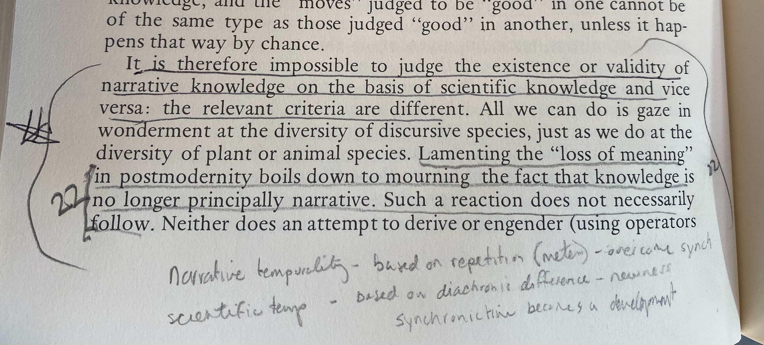 Side note: I’m going back to a copy of The Postmodern Condition that I’ve owned since 1993. As I go through it again, I’m finding different passages important compared to what I marked up when I first read it in the early-1990’s as an ardent, young, self-identified “post-structuralist.” To mark the different readings, I’m noting “22” (for 2022) where I make notes in the margins today.